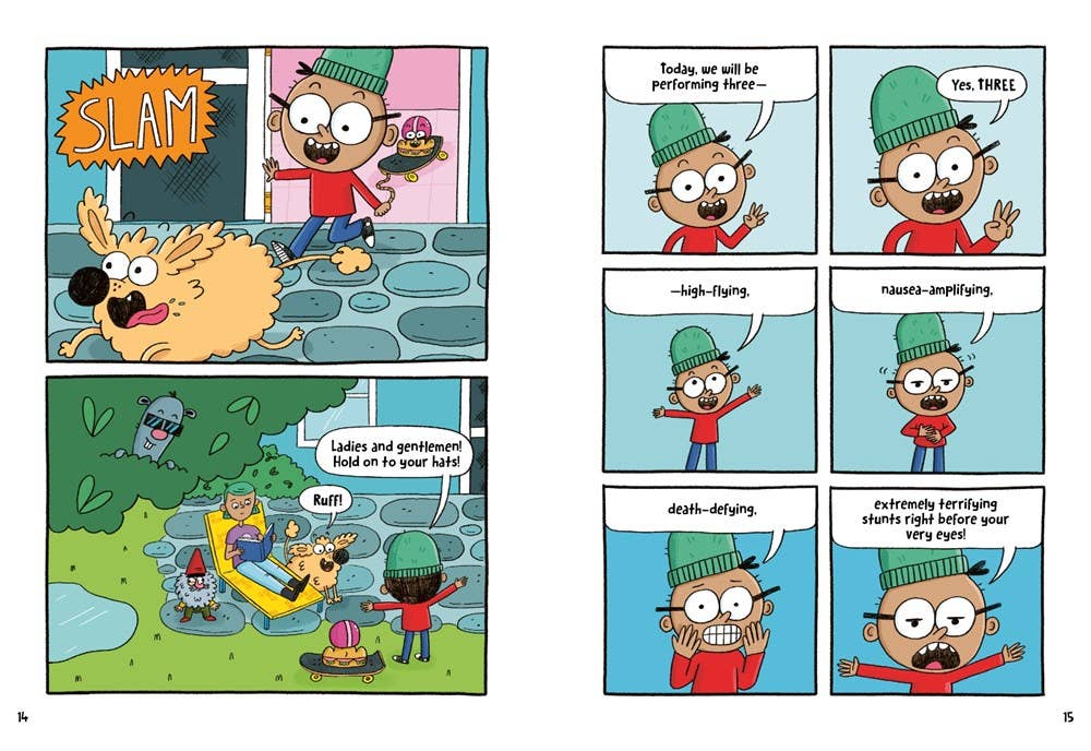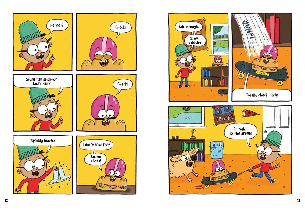 Ever since Marco's sandwich began talking, the two have been inseparable. Their shared love for jokes, pranks on Marco's sister, and special sauce are a recipe for best friends. After defeating a pair of break-dancing squirrels in the backyard, Sandwich and Marco are ready for more shenanigans. But when a rainy day foils their plans they’re at their wits end. That is, until lightning strikes and Marco devises the best plan EVER… Death-defying jumps and high-flying acrobatics abound in this rip-roaring new graphic novel. Introducing Stunt Sandwich Superstar!